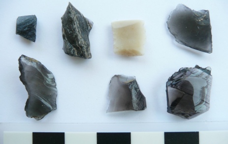 Surface finds of obsidian: Most of the obsidian implements and debitage so far found at Ughtasar have come from the margins of the seasonal lakes, suggesting that the lithic material was probably knapped nearby. Obsidian does not occur naturally at Ughtasar so all the material must have been brought to the site, perhaps as pebbles collected from the Vorotan River 23kms away, or from one of the original volcanic sources such as Mounts Bazenk, Sevkar or Satanakar