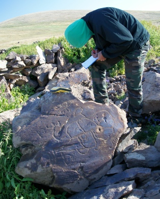 Methodology: The methodology developed for recording the petroglyphs at Ughtasar is based on ‘rapid survey’, with follow-up ‘specialist photography’ and ‘GPS/topographical survey’. These techniques are applied to all of the carved rocks, including those marked with modern ‘graffiti’, in order to achieve the key objective of a total quantitative survey of the rock art within the study area. The techniques have been chosen and progressively refined in order to cope with the demands of working within a tight budget at high altitude in a remote, challenging and often harsh environment.