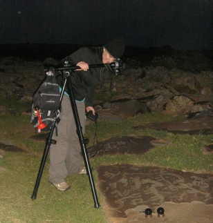 Specialist photography: As a second stage in the recording each rock and its immediate surroundings is subsequently photographed more fully using higher-grade equipment, carefully chosen camera angles and (when and where possible) lighting that will show the petroglyphs to best advantage. This may involve one or more episodes of photography and the collection of a substantial number of images for the more complex rocks. A circular polarising filter is used on occasions to emphasise the contrast between the shiny rock surface and the more roughly textured petroglyphs.